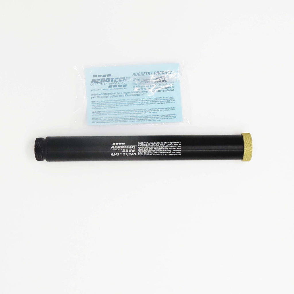 For use with all AeroTech RMS-29/240 high power motor reload kits. This reusable AeroTech RMS-29/240 motor hardware set includes the aluminum motor case, motor forward closure, forward seal disc, motor aft closure, and a 1cc tube of the Super-Lube grease for assembly. Motor reloads sold separately. Important: High Power RMS reload kits are not compatible with Mid Power RMS products.