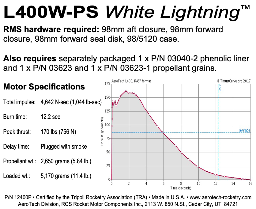This RMS motor reload utilizes RCSs exclusive White Lightning™ aerospace grade composite propellant formulation, which produces a gorgeous bright white flame with lots of dense white smoke and a throaty roar at lift-off.