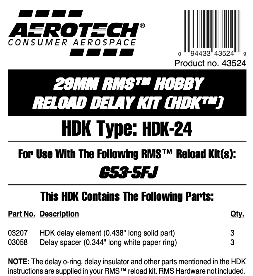 The AeroTech HDK-24 is for use with G53-5FJ (73305) motors. The motor hobby delay kit comes with 3 rocket delay elements and spacers. Motor delay O-rings, delay insulators and other parts are supplied with the RMS reload kits. Note that Hobby Delay Kits and High Power Delay Kits are not interchangeable.
