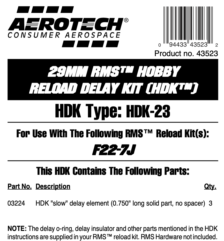 The AeroTech HDK-23 is for use with F22-7J (62207) motors. The motor hobby delay kit comes with 3 rocket delay elements and spacers. Motor delay O-rings, delay insulators and other parts are supplied with the RMS reload kits. Note that Hobby Delay Kits and High Power Delay Kits are not interchangeable.