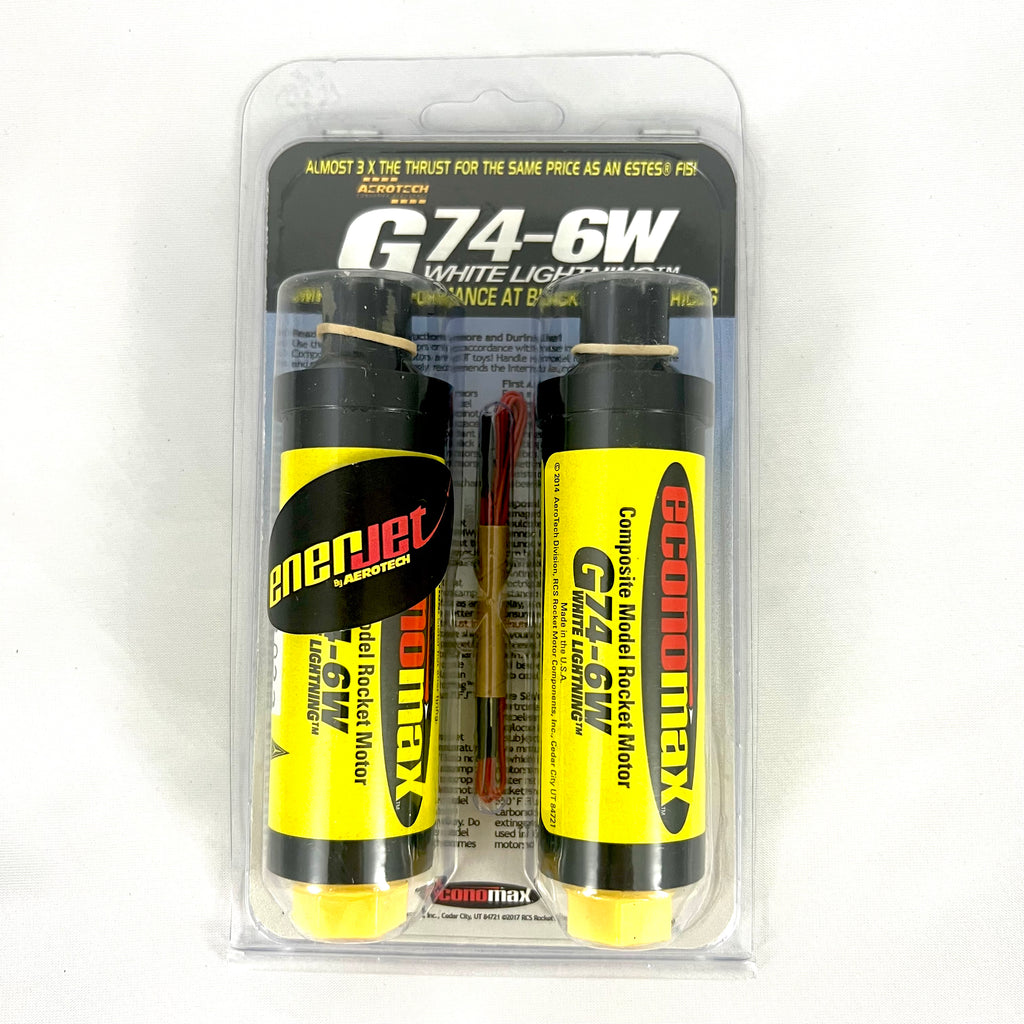 Enerjet G74-6W mid-power motors are single-use composite propellant model rocket motors. These high performance, composite propellant model rocket motors use the same family of solid propellant as NASA’s Space Shuttle Boosters, military missiles, sounding rockets, and NASA’s future SLS moon rocket. They utilize a patent pending high-strength polymer case and bulkhead, polymer nozzle and RCSs exclusive White Lightning™ aerospace grade composite propellant formulation, which produces a gorgeous bright white flame with lots of smoke and a throaty roar.