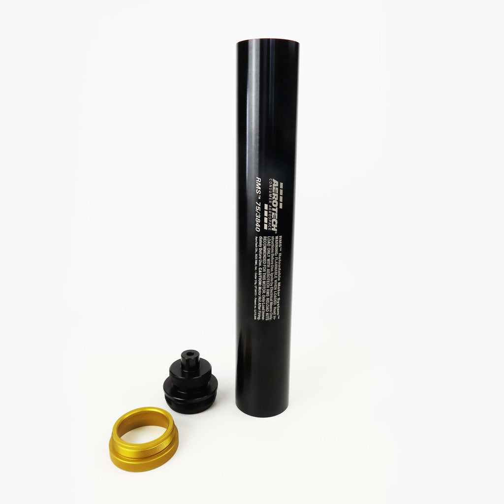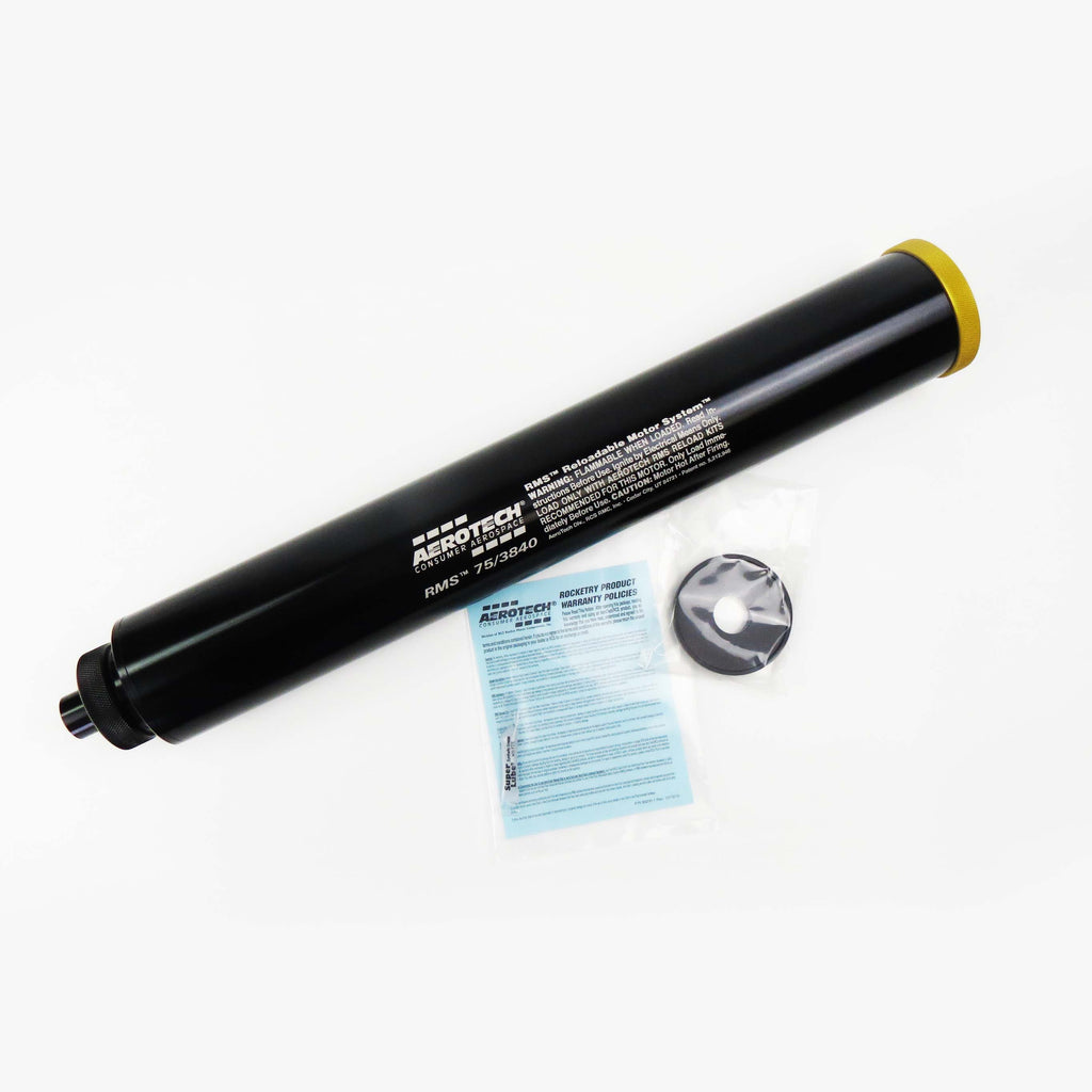 For use with all AeroTech RMS-75/3840 high power motor reload kits. This reusable AeroTech RMS-75/3840 motor hardware set includes the aluminum motor case, 75mm Forward Seal Disc, 75mm Forward Closure, 75mm Aft Closure, and a 1cc tube of the Super-Lube grease for assembly. Motor reloads sold separately. Important: High Power RMS reload kits are not compatible with Mid Power RMS products.