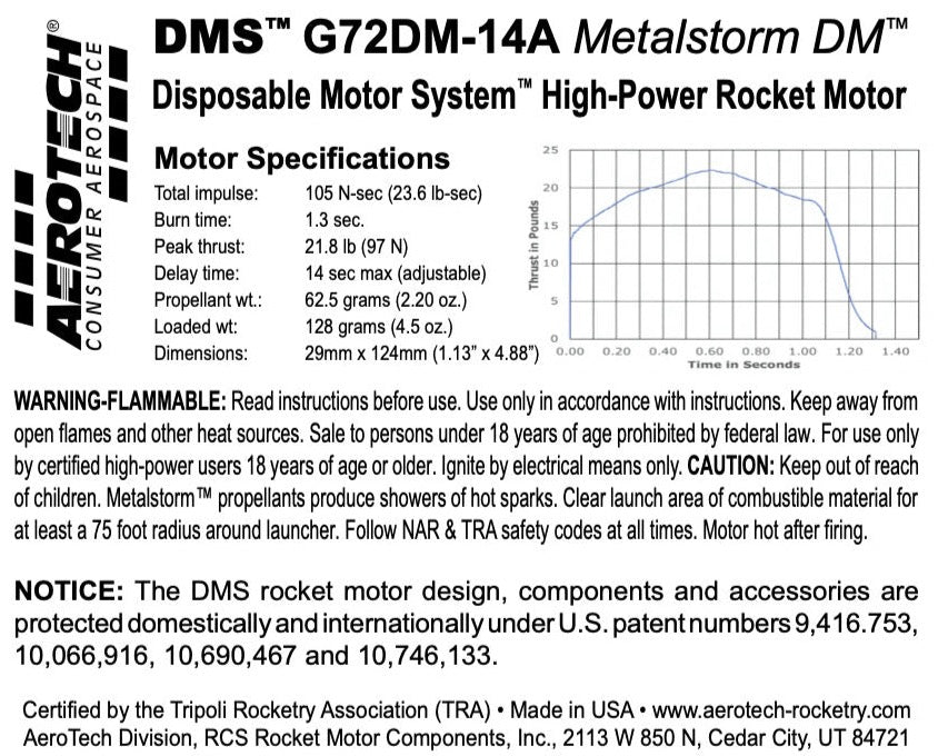 DMS motors feature a filament-wound fiberglass casing, a glass-reinforced composite phenolic nozzle, a molded plastic bulkhead and RCSs exclusive Dark Matter™ aerospace grade composite propellant formulation. Dark Matter™ is a sparky propellant, but unlike Metalstorm™ with its higher ISP and white smoke, Dark Matter™ is a black smoke sparky motor. As with all rocket motors using spark-generating propellants, special precautions must be taken to avoid fires around the launch pad by clearing the immediate area of all combustible materials in accordance with applicable fire and safety codes.