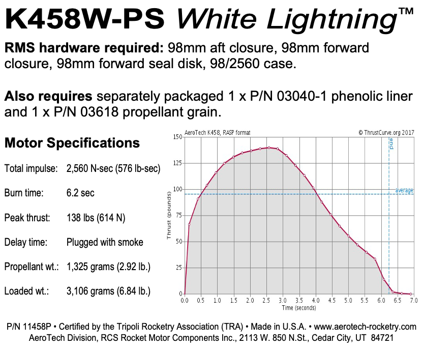 This RMS motor reload utilizes RCSs exclusive White Lightning™ aerospace grade composite propellant formulation, which produces a gorgeous bright white flame with lots of dense white smoke and a throaty roar at lift-off.
