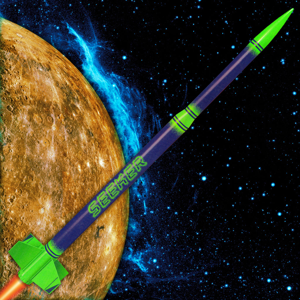 The Seeker model rocket is quick off the pad and even quicker to build. The Seeker model rocket is a great choice when building time is limited. With pre-finished colored body tubes and a full self-adhesive decal set the Seeker model rocket goes from 'kit to pad' faster than you can say “wow!” Includes a large payload section too.