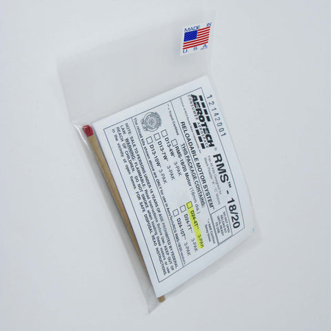 The AeroTech Reloadable Motor System RMS is an aluminum cased reusable motor in kit form that is assembled by the user. You will need AeroTech RMS-18/20 motor hardware to build and complete the motor for many reliable flights. Motor hardware is available separately in a complete set, and also as individual parts. Important: Mid Power RMS reload kits are not compatible with High Power RMS products. This RMS motor reload utilizes RCSs exclusive Blue Thunder™ aerospace grade composite propellant formulation, which produces a gorgeous bright violet-blue flame with a minimum of exhaust smoke. Blue Thunder™ motors provide a higher level of thrust than White Lightning™ motors of the same total impulse and are perfect for high lift-off acceleration.