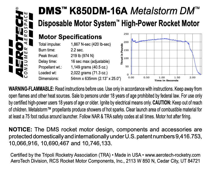 DMS motors feature a filament-wound fiberglass casing, a glass-reinforced composite phenolic nozzle, a molded plastic bulkhead and RCSs exclusive Dark Matter™ aerospace grade composite propellant formulation. Dark Matter™ is a sparky propellant, but unlike Metalstorm™ with its higher ISP and white smoke, Dark Matter™ is a black smoke sparky motor. As with all rocket motors using spark-generating propellants, special precautions must be taken to avoid fires around the launch pad by clearing the immediate area of all combustible materials in accordance with applicable fire and safety codes.