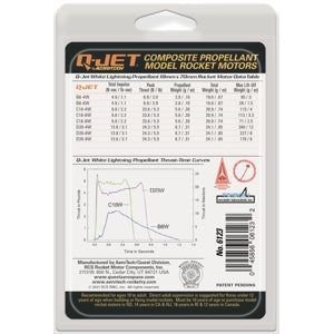 Quest Q-Jets are the world's most advanced 18mm model rocket motors. Q-Jet™ high performance, composite propellant model rocket motors use the same family of solid propellant as NASA’s Space Shuttle Boosters, military missiles, sounding rockets, and NASA’s future SLS moon rocket. They utilize a patent pending high-strength polymer case and bulkhead, ceramic nozzle and RCSs exclusive White Lightning™ aerospace grade composite propellant formulation, which produces nearly double the specific impulse (or ISP, a propellant efficiency rating) of conventional black powder propellant. They are not susceptible to thermal cycling like black powder motors. Q-Jet™ White Lightning™ rocket motors deliver a brilliant white exhaust plume, dense bright white smoke trail and a throaty roar as the hallmarks of this popular propellant. Easy to track. Exciting to watch!