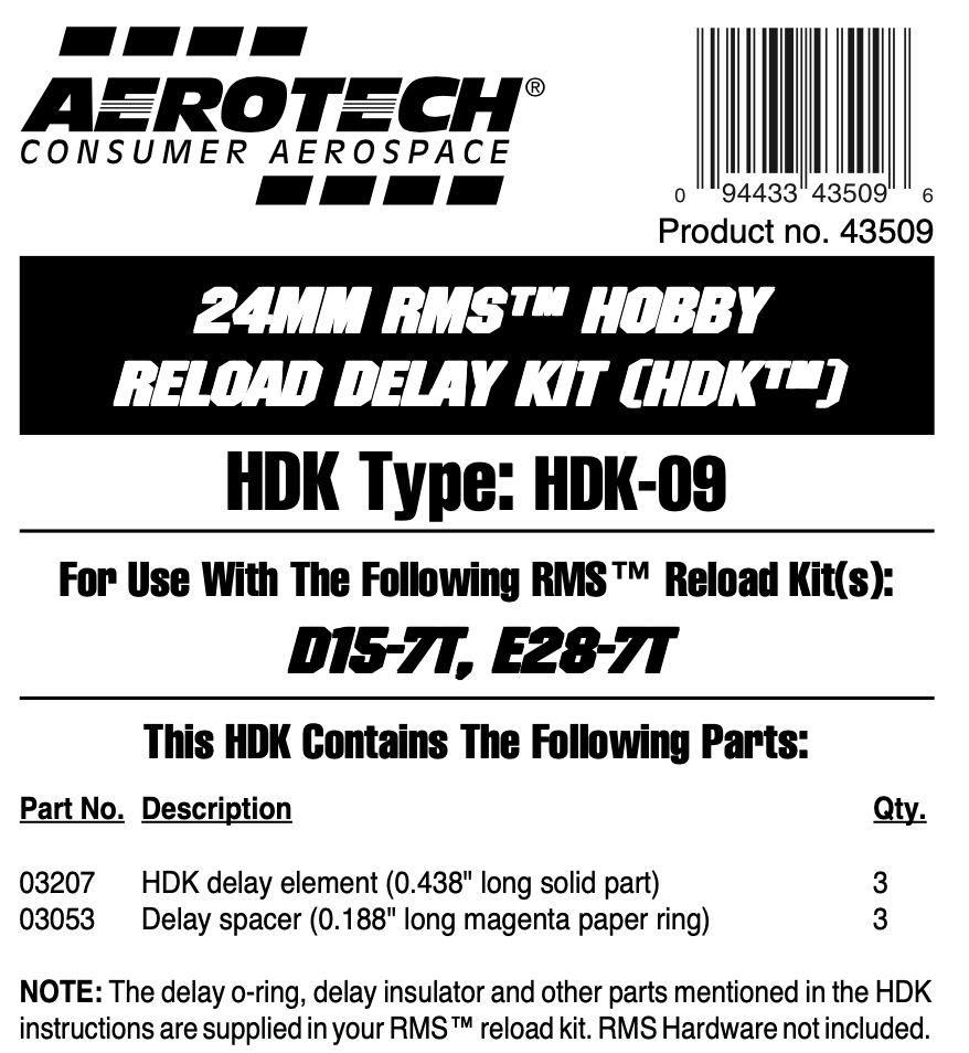 The AeroTech HDK-09 is for use with D15-7T (41507) and E28-7T (52807). The motor hobby delay kit comes with 3 rocket delay elements and spacers. Motor delay O-rings, delay insulators and other parts are supplied with the RMS reload kits. Note that Hobby Delay Kits and High Power Delay Kits are not interchangeable.
