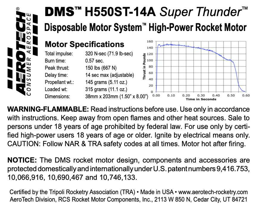 DMS motors feature a filament-wound fiberglass casing, a glass-reinforced composite phenolic nozzle, a molded plastic bulkhead and RCSs exclusive Super Thunder™ aerospace grade composite propellant formulation, which produces a bright violet-blue flame with a minimum of exhaust smoke. Super Thunder™ motors provide a higher ISP than Blue Thunder™.