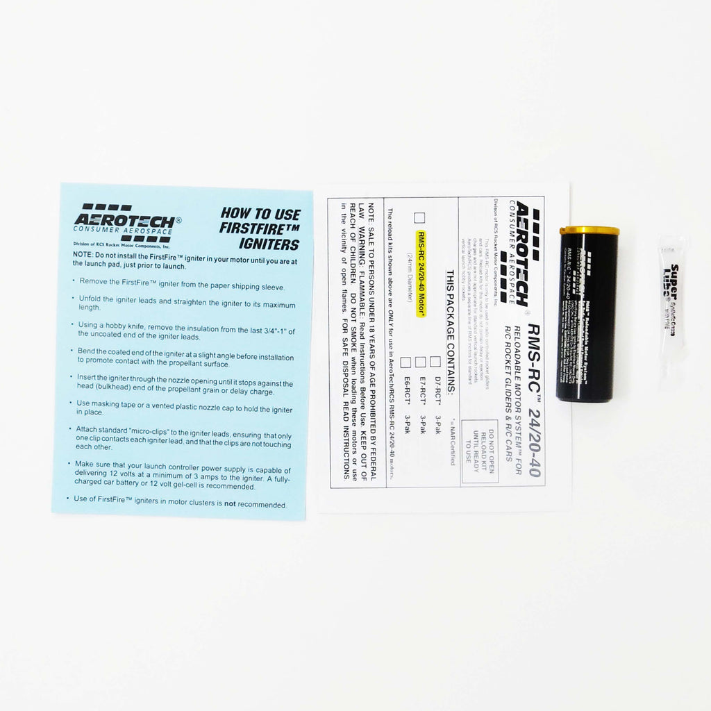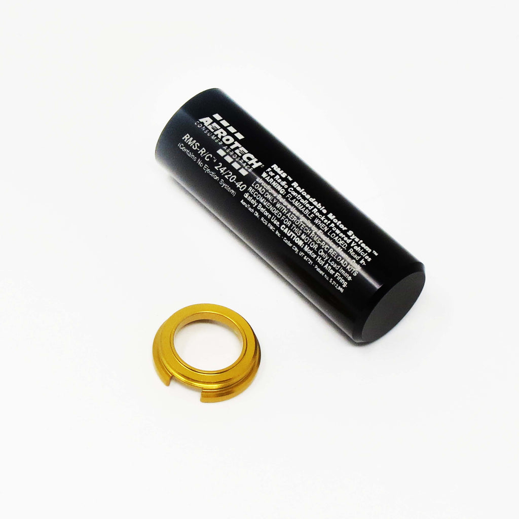 For use with all AeroTech RMS-R/C-24/20-40 motor reload kits. This reusable AeroTech RMS-R/C-24/20-40 motor hardware set includes the aluminum motor case, permanently plugged forward closure, aluminum motor aft closure, and a 1cc tube of the Super-Lube grease for assembly. Motor reloads sold separately. Important: Mid Power RMS reload kits are not compatible with High Power RMS products.