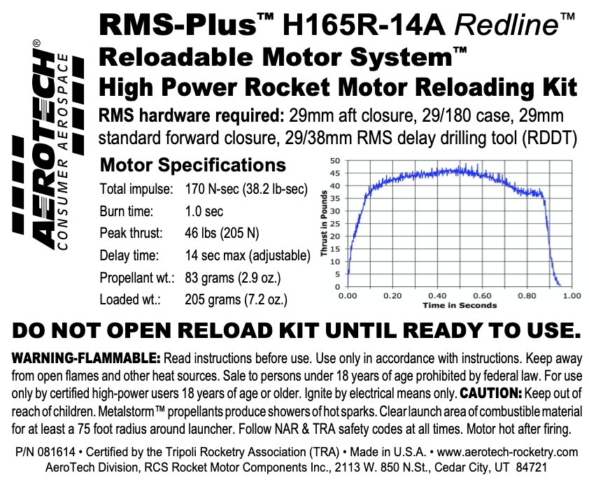 The AeroTech motor reload kit comes with 1 rocket motor reload. Reload kits include all internal motor components and FirstFire™ Initiators. This AeroTech motor is U.S. mailable with no hazmat fee! The sale of this high power motor to persons under 18 years of age is currently prohibited by federal law. This is a High-Power motor requiring Level 1 High-Power certification through NAR or Tripoli to purchase. Orders containing this item will not be shipped until proof of age (such as a copy of a driver’s license) and proof of Level 1 certification is received.