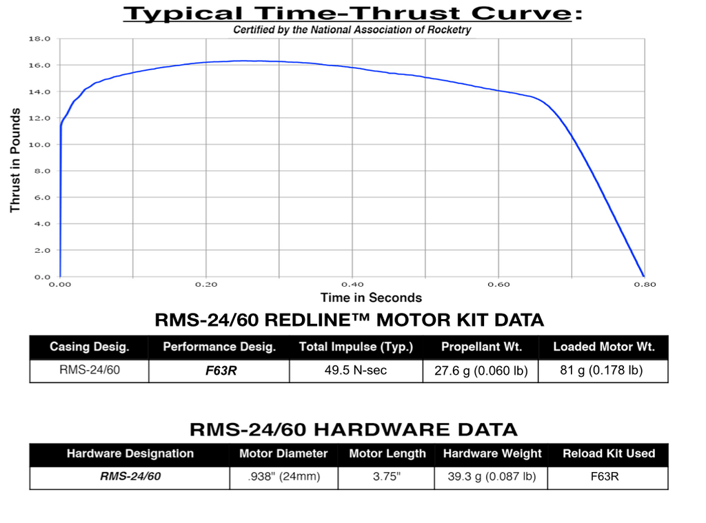 The AeroTech Reloadable Motor System RMS is an aluminum cased reusable motor in kit form that is assembled by the user. You will need AeroTech RMS-24/60 motor hardware to build and complete the motor for many reliable flights. Motor hardware is available separately in a complete set, and also as individual parts. Important: Mid Power RMS reload kits are not compatible with High Power RMS products. This RMS motor reload utilizes RCSs exclusive Redline™ aerospace grade composite propellant formulation, which produces a visible scarlet flame. Redline™ motors burning rate lies midway between that of White Lightning™ and Blue Thunder™. Photos don’t do justice to the “laser-beam” intensity and color of Redline™…. you have to see it to appreciate it!