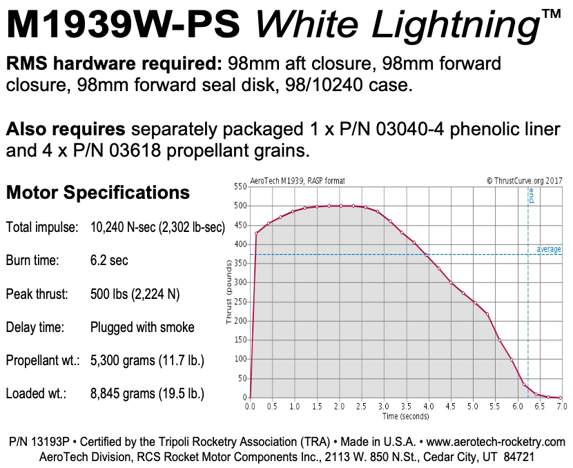 This RMS motor reload utilizes RCSs exclusive White Lightning™ aerospace grade composite propellant formulation, which produces a gorgeous bright white flame with lots of dense white smoke and a throaty roar at lift-off.
