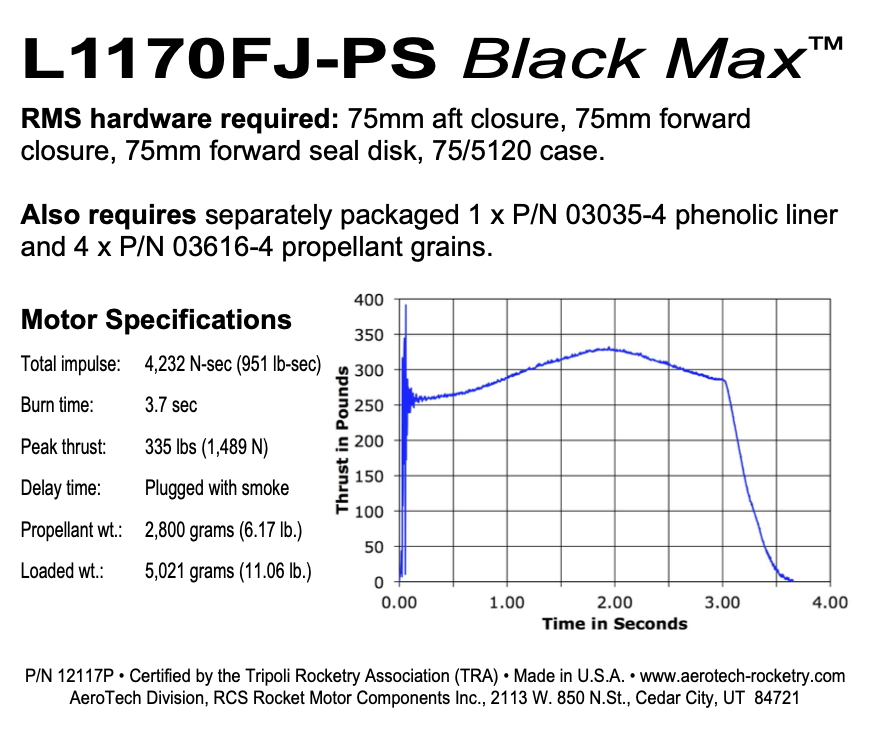 This RMS motor reload utilizes RCSs exclusive Black Max™ aerospace grade composite propellant formulation, which produces a visible black exhaust plume and a denser dark tracking smoke. Black Max™ motors provide a higher level of thrust than White Lightning™ motors of the same total impulse and are perfect for high lift-off acceleration.