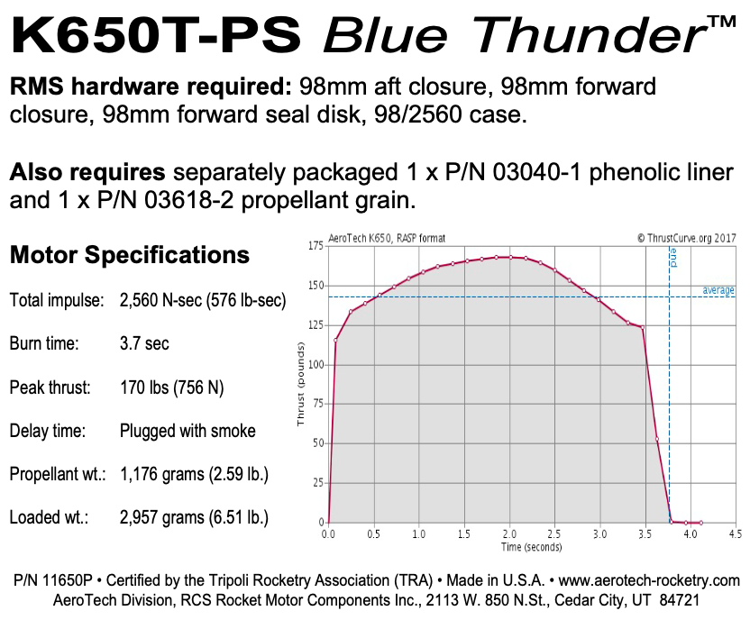 This RMS motor reload utilizes RCSs exclusive Blue Thunder™ aerospace grade composite propellant formulation, which produces a gorgeous bright violet-blue flame with a minimum of exhaust smoke. Blue Thunder™ motors provide a higher level of thrust than White Lightning™ motors of the same total impulse and are perfect for high lift-off acceleration.