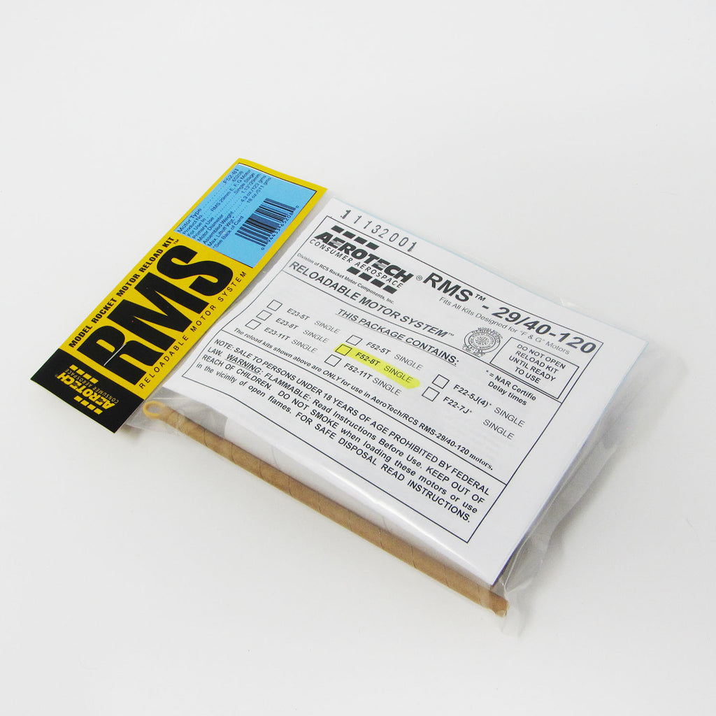 The AeroTech Reloadable Motor System RMS is an aluminum cased reusable motor in kit form that is assembled by the user. You will need AeroTech RMS-29/40-120 motor hardware to build and complete the motor for many reliable flights. Motor hardware is available separately in a complete set, and also as individual parts. Important: Mid Power RMS reload kits are not compatible with High Power RMS products. This RMS motor reload utilizes RCSs exclusive Blue Thunder™ aerospace grade composite propellant formulation, which produces a gorgeous bright violet-blue flame with a minimum of exhaust smoke. Blue Thunder™ motors provide a higher level of thrust than White Lightning™ motors of the same total impulse and are perfect for high lift-off acceleration.